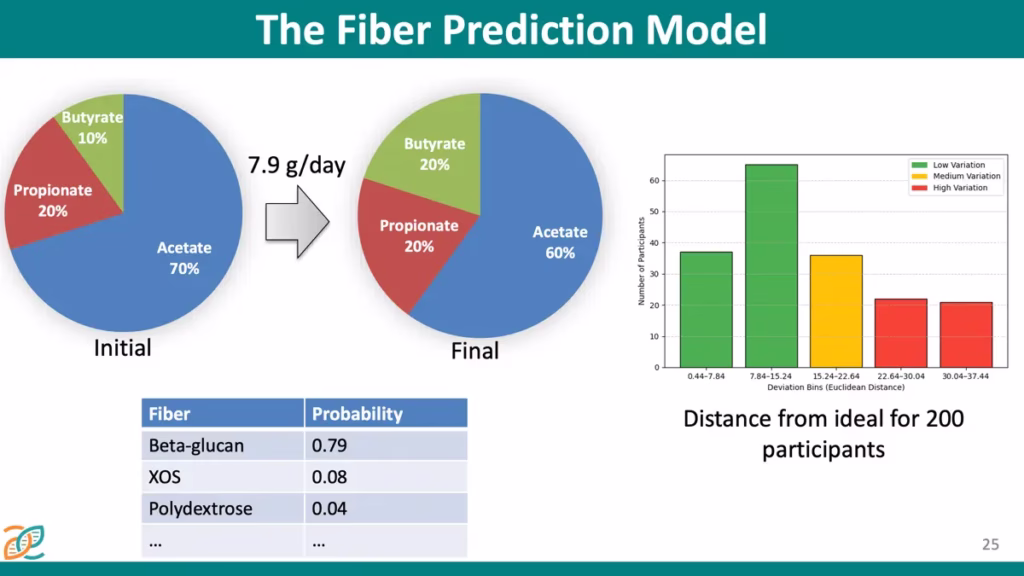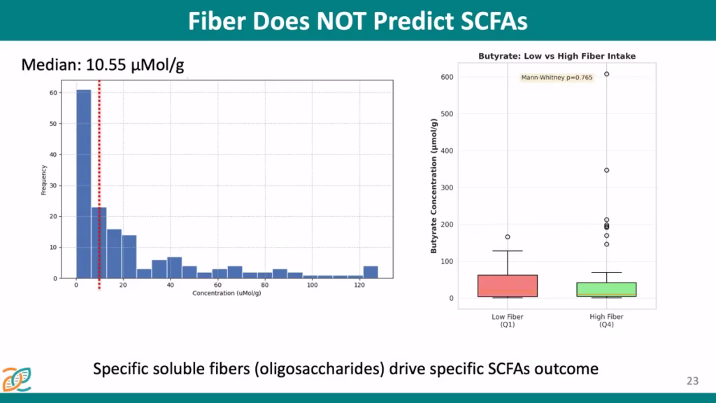 A key finding presented was that total dietary fiber intake did not correlate with, and did not predict, SCFA levels within the study cohort. This challenges the conventional approach of broadly recommending increased fiber intake and supports the use of personalized fiber recommendations.