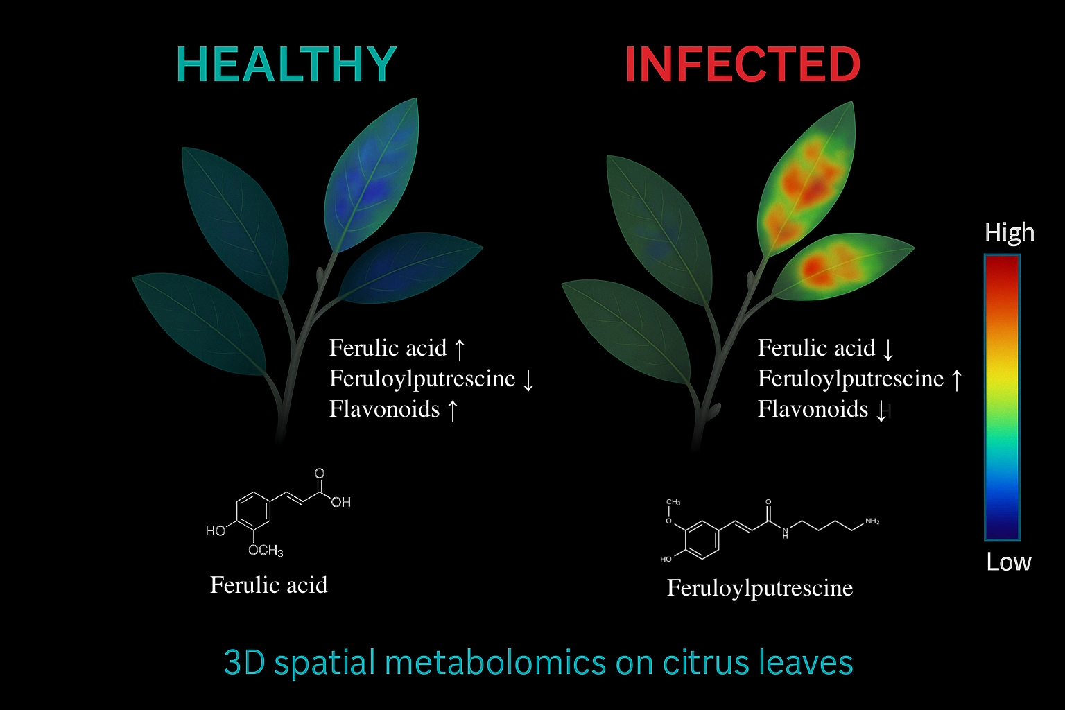 The research team employed a combination of mass spectrometry-based metabolomics and 3D molecular mapping to visualize complex chemical changes within HLB-infected citrus trees. This approach led to several significant discoveries:
